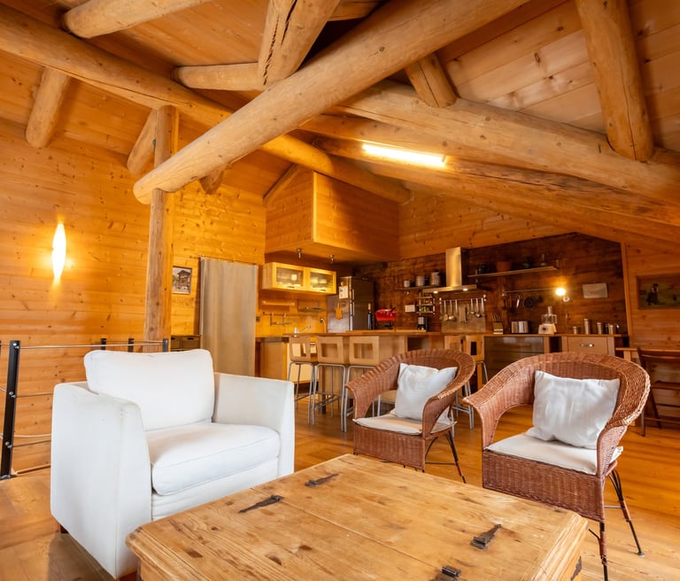 Superb all-wood chalet. The living room is spacious and ideal for meeting up with family or friends.